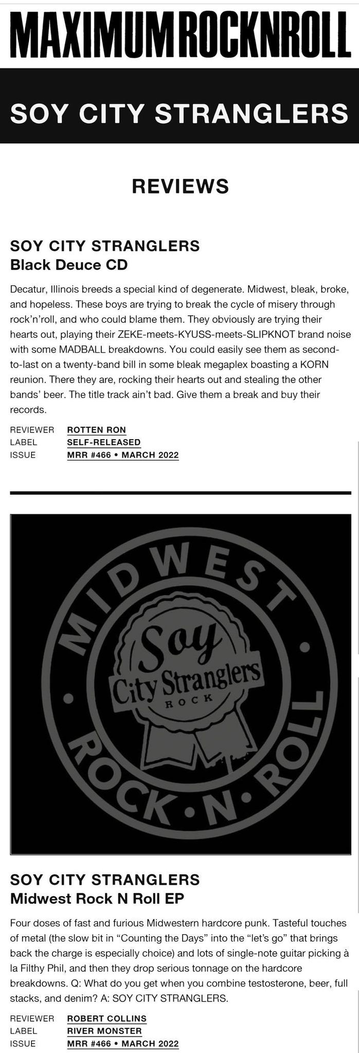From the depths of America’s rust belt come the Soy City Stranglers. Forming in 2008, this five piece has made the most out of their surroundings in the urban wasteland of Decatur, IL and delivered a sonic assault of beer-fueled leather clad intensity not seen since the Regan era. The raging dual guitars, a tight bombastic rhythm section, and the nihilistic spitted vocals of Billy Fury converge into tunes comparable to the finer works of The Dwarves, Poison Idea, and The New Bomb Turks. The boys will be touring across the country until the whiskey runs out. They recorded their self-titled debut with Matt Talbot (Hum, Centaur). They play fast. Enjoy!